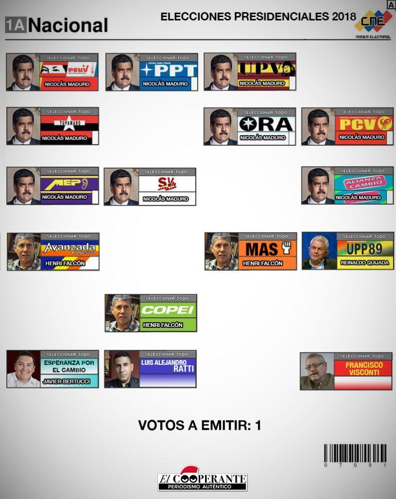 Al día siguiente, formalizó su candidatura Nicolás Maduro, postulado por el Partido Socialista Unido de Venezuela (Psuv), Movimiento Somos Venezuela, Movimiento Tupamaro, Unidad Popular Venezuela (UPV), Podemos, Patria Para Todos (PPT), Organización Renovadora Autentica (ORA), Alianza Para el Cambio (APC), Movimiento Electoral del Pueblo (MEP) y Partido Comunista de Venezuela (PCV).