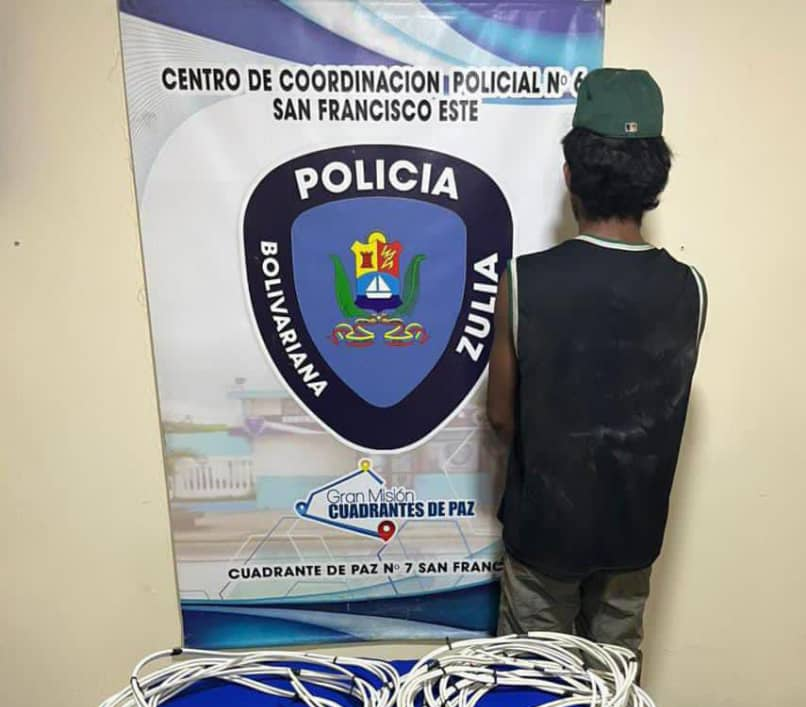 Un hombre, señalado por la comunidad como azote, fue detenido por patrulleros del Cuerpo de Policía Bolivariana del estado Zulia (Cpbez) en el sector Plaza El Sol, municipio San Francisco, tras ser sorprendido hurtando el cableado eléctrico de un establecimiento comercial.