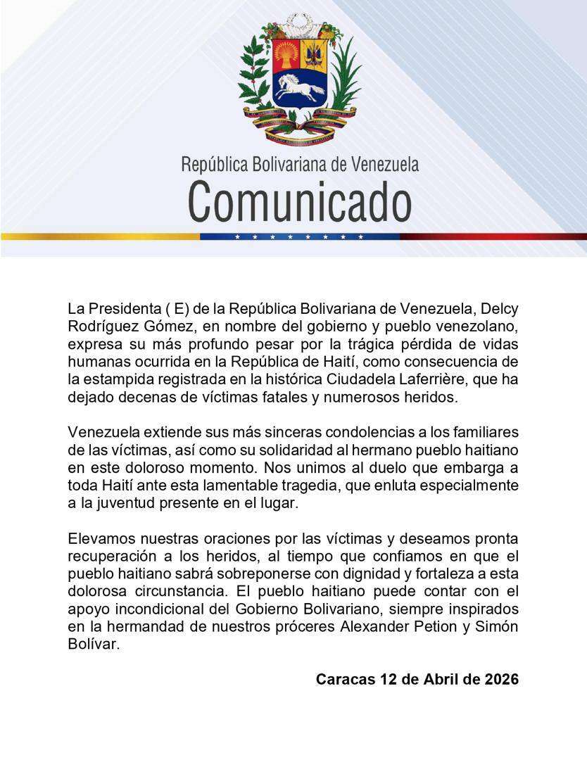 A través de un comunicado oficial, el Ejecutivo manifestó su solidaridad y el canciller Yván Gil fue el encargado de difundir el mensaje. La vicepresidenta Delcy Rodríguez también hizo llegar sus condolencias a los familiares de las víctimas. En el comunicado se enfatizó el impacto humano del suceso y se reiteró el apoyo a la nación haitiana en este difícil momento, destacando la importancia de la solidaridad entre los pueblos de la región.